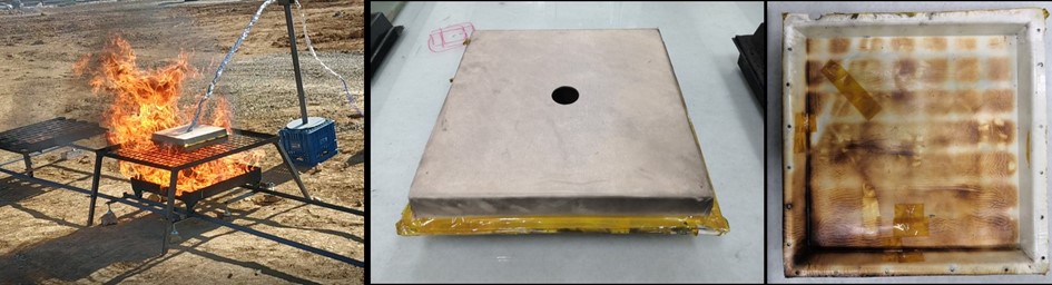 After 33 seconds at 1,300 degrees, thermal runway fires are caused in Aluminium covers (aluminium sheet is penetrated by flame). The solution Hankuk Carbon proposes, a glass fiber flame retardant composite material, is intact even after 30 minutes of exposure to fire in the same condition as the aluminium.